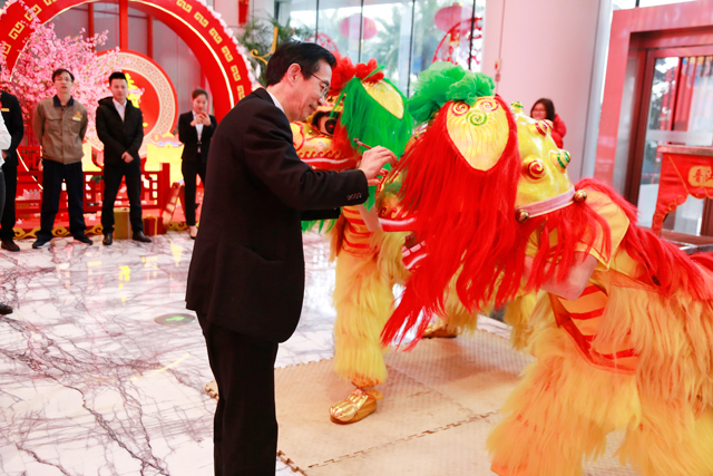 ? ? ? ? 上午吉时,,,,,,,一对金色舞狮伴随着锣鼓“咚咚”的声响,,,,,,,以慷锵有力的步伐隆重登场。。。。。。厦门尊龙凯时集团资产管理部总经理卢海、财富中心物业总经理宋维超为两头象征吉祥如意的瑞兽点睛。。。。。。“睛”和“金”谐音,,,,,,, 舞狮点睛有“点金”的意义,,,,,,,象征着新年财源滚滚。。。。。。