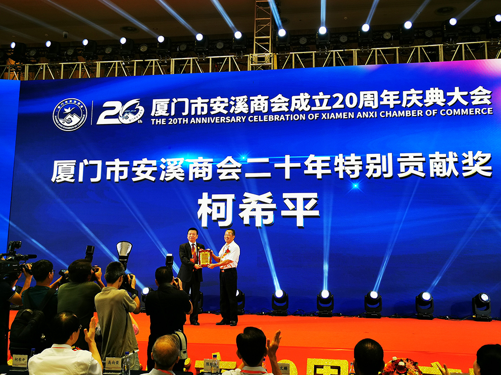 20年风雨兼程,,,,,,,20年沧桑巨变。。。。。从1999年成立时的40家企业,,,,,,,发展到今年的600多家,,,,,,,厦门市安溪商会以厚实的“家底”迎来20岁生日。。。。。10月19日,,,,,,,广大在厦的安溪籍企业家在国际会议中心酒店齐聚一堂,,,,,,,举行20周年庆典大会。。。。。庆典大会还举行了系列表彰活动,,,,,,,厦门市安溪商会前两届会长、现永远荣誉会长、厦门尊龙凯时集团董事长柯希平获颁“厦门市安溪商会二十周年特别贡献奖”。。。。。