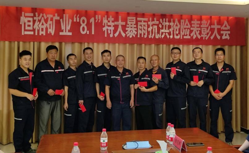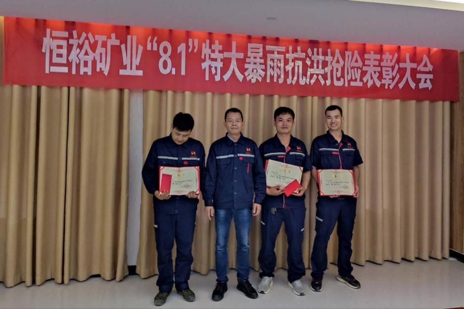 随后,,,,,,,,公司常务副总经理罗贤仁宣读了《恒裕公司关于表彰“8.1”特大暴雨抗洪抢险先进个人和积极分子的决定》,,,,,,,,对庄振东、王成啟、陈金峰等24名员工进行通报表彰;公司董事长柯银辉和总经理罗耀坤分别为受表彰人员颁奖并合影留念;先进个人代表陈金峰发表了表彰感言。。。。。。。。