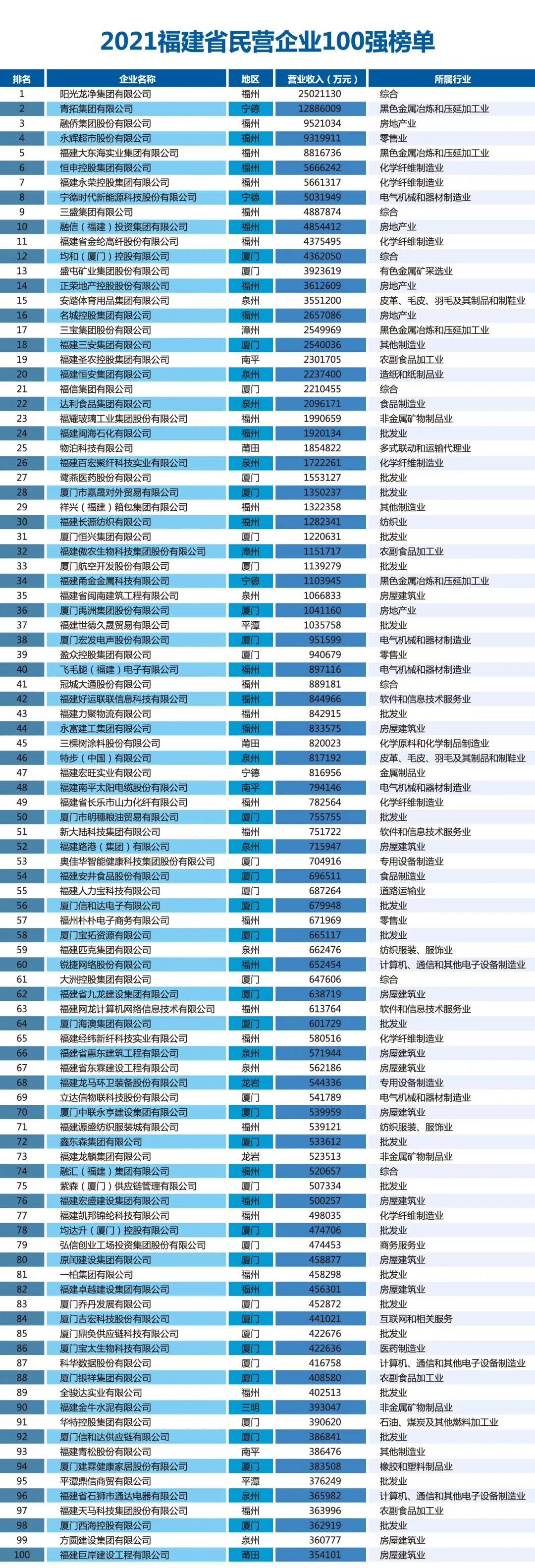 会上,,,,,省委统战部副部长、省工商联党组书记李家荣代表省工商联发布了“2021福建省民营企业100强”“2021福建省创新型民营企业100强”“2021福建省民营企业制造业50强”榜单。。。。。。“2021福建省民营企业100强”中,,,,,尊龙凯时位列第31位,,,,,厦门宝拓资源有限公司位列第58位。。。。。。